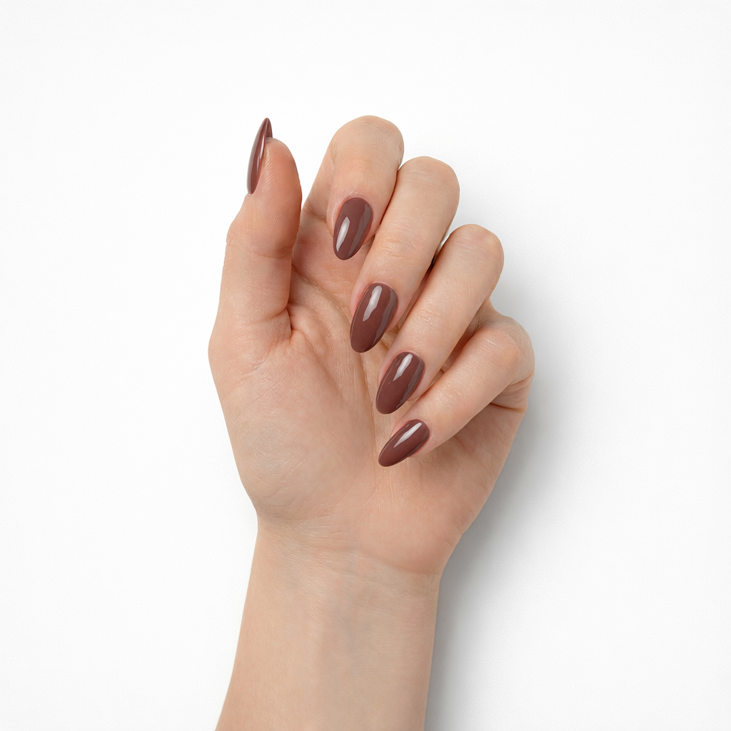 Mocha Nude features press-on nails in a deep mocha brown shade with a glossy finish, creating a warm, sophisticated manicure that feels modern, elegant, and perfect for everyday wear.